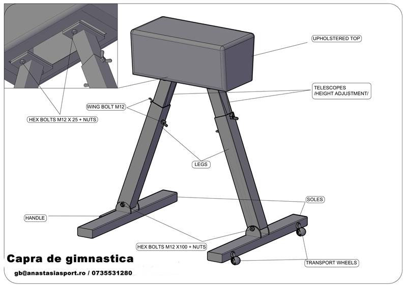Capra gimnastica Anastasia Sport, calitate superioara, roti pentru transport, inaltime reglabila 90 - 140 cm
