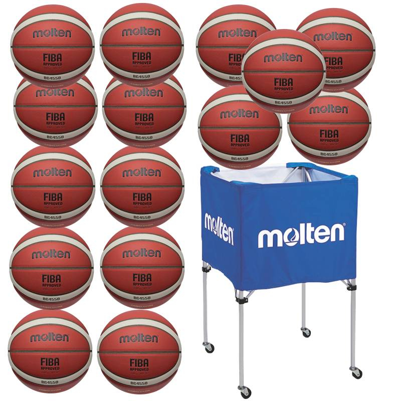 The set includes 15 Molten B7G4550 basketballs, size 7, approved by FIBA for the 2023–2027 period (Level 1 and 2), together with the Molten BK0012-B mobile ball cart for storage and transport.