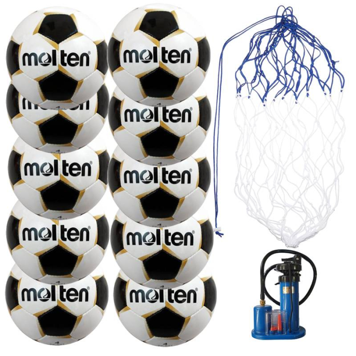 Set of 10 Molten PF540 Footballs Size 5 + BN10 Ball Carry Net + Strong 1517 Pump – Training Set for Schools and Clubs