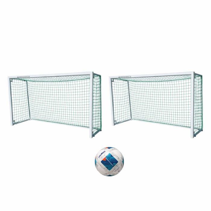 Buy a complete mini football and futsal set with 2 steel Ø80 mm goals, Huck nets, and Molten F5N1710 ball. Ideal for training, schools, and sports clubs. Suitable for indoor and outdoor use.