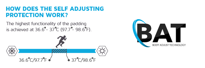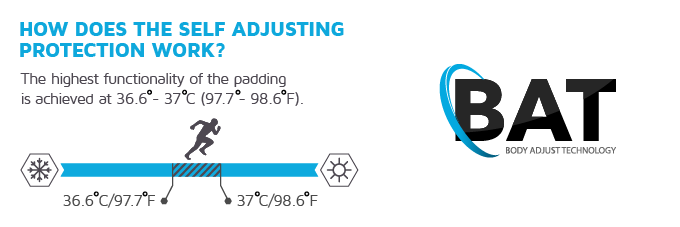 Datorita testelor ample s-a gasit cea mai buna forma si pozitie a padurilor. Comparativ cu alte marci*, se foloseste forma sferica a padurilor in scopul de a asigura protectia maxima a cotului. Prin utilizarea materialelor unice de absorbtie a socurilor, cu o grosime care variaza intre 2 – 7 mm, se ofera un nivel ridicat de confort.